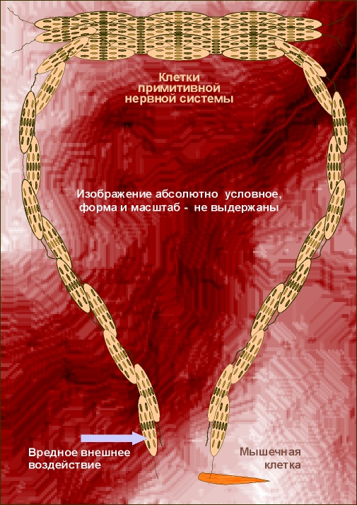 Возможно, настолько сильно, что соответствующие изменения доходят и до самых дальних уголков этой группы клеток, в т.ч., находящихся в противоположных отростках группы (будущих "нервах"). Отростки центральной группы новых "специальных" клеток с особыми свойствами могут быть разветвленными и переплетенными таким образом, что конец какого-то n-ного отростка попадет в ту же зону организма, в которой находится и начало самой первой рассмотренной нами клетки. И она оспытает такое же (хотя и несколько ослабленное) изменение/возбуждение, как и вся центральная специализированная группа. В целом реакция возбуждения прокатится по всей рассмотренной цепочке, как бы в виде специфического импульса. И в некоторых случаях вполне может случиться так, что возбуждение передасться и расположенной рядом с последней "специфической" еще и "обычной" клетке, например, клетке мышечной ткани (или их группе). И она(они) немного сократится(тятся). Участок тела отстранится от источника первичного воздействия, как бы одернется от него. Воздействие прекратится, а сигнал о нем прервется. Круг замкнулся. Дело сделано. И дело вполне разумное, хотя и примитивное. В этом рассмотренном нами гипотетическом случае показан полный цикл вполне возможных событий и, фактически, явное начало адаптации организма по отношению к воздействию внешего мира. Если случиться так, что в последний момент времени воздействие крайней специфической клетки на клетку мышечную вызовет сокращение последней, направленное в невыгодную для организма сторону (то есть, оно будет действовать "не на ту" мышцу), то такой организм, скорее всего, просто погибнет и соответствующие "нововведения" в нем никому генетически, по наследству, не передадутся. То же самое случится и при слишком медленных реакциях по всей цепи, то есть, медленной, не импульсной, скорости физико-химических процессов в ней. Зато "правильные" (выгодные) реакции и анатомическое строение организма позволят ему не только выжить с новыми, благоприобретенными способностями, но и передать (простым выживанием и последующим размножением) их генетически своим потомкам, закрепляя процесс эволюционного совершенства данного вида. Больше об этом см. в теме Эволюция.