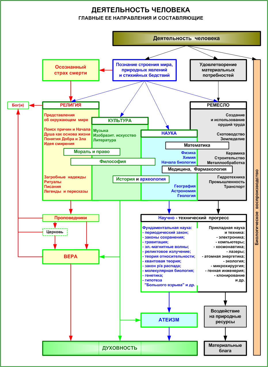 На этом рисунке черным цветом обозначена прикладная деятельность, направленная, в основном, на достижение материальных благ, красным - духовная деятельность в традиционном понимании, зеленым - духовная деятельность в принятом на данном сайте расширенном смысле, синим - научное познание, которое в прежние времена почему-то не относилось к духовности, хотя уже давно стало ее частью.