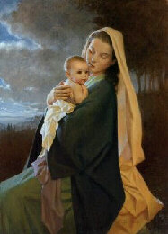 Как уже было сказано, еще в трехлетнем возрасте родители Марии (см. первую историю) отдали свою дочь во служение Господу, навсегда, под опеку Храма, где она оказалась, как показано выше, на положении приемной дочери Захарии и Елисаветы. Отдавать своих долгожданных детей во служение Господу - давнишняя, еще ветхозаветная традиция иудеев. Так поступили в свое время, за 1200 лет до рождения Иисуса Христа, некие Анна и Елкана, отдав в дом Господа (синагогу), в услужение священнику Илию, своего первого сына Самуила (правда, уже в его отроческом возрасте). Этот сын стал потом священником, пророком и одновременно судьей Израиля, помазавшим на царство первого израильского царя Саула. "Находилась же Мария в храме Господнем как голубка..." А уже в ее 12 лет появилась беспокойство жрецов "чтобы она каким-либо образом не осквернила святынь". Первосвященник Захария по совету высших сил (явившегося во время его молитвы ангела) собрал старых "вдовцов из народа", чтобы по жребию (считавшимся знамением Господним) передать Марию одному из них на попечительство. Был призван на эту процедуру и плотник Иосиф, который "оставив топор, тоже пришел на место, где собирались". Трудно представить себе, что он, стареющий вдовец, "пришел" издалека. Хотя "пришел" может означать и "прибыл". (Все здесь зависит от качества литературного перевода Библии, к сожалению, совсем невысокого). Прибыли же откуда-то и другие вдовцы! Наверняка были среди них и те, путь которых был совсем не близким. Поэтому не исключено, что местом жительства Иосифа до этого момента был именно Назарет. Но возможно также и то, что он попал туда и гораздо позже, спустя несколько лет. И жребий (знамение, заключавшееся в том, что из его посоха вылетела голубка - явный визуальный образ Святого Духа), выпал именно Иосифу. Ему и была передана Мария, "чтобы блюсти ее". Повторные браки тогда были запрещены, поэтому официальной женой Иосифу Мария не стала. Но они были обручены перед Господом. Поэтому нашего вдовца иногда называют еще Иосифом-Обручником. Иосиф привел Марию в свой дом и оставил ее там, а сам удалился "для плотничьих работ", по данным Иакова - примерно на три года (возможно, с сыновьями от первого брака; а может - и без них, эту деталь никто не уточняет). То есть, надолго предоставил девушку самой себе, которой к концу столь длительного отсутствия Иосифа исполнилось 15 с небольшим. (Не особо усердно "блюл" он ее, однако!) Однажды, когда Мария занималась рукоделием, перед ней появился ангел, который сказал (далее цитаты разных евангелистов объединены по общему смыслу): "Не бойся, Мария, ибо ты обрела благодать у Бога" и "зачнешь по слову Его", "...рожденное тобой Святое наречется сыном Всевышнего. И наречешь ему имя Иисус, ибо Он спасет народ свой", "и даст ему Господь Бог престол Давида", "и Царству Его не будет конца" (это уже и материальные посулы!). "Вот и Елисавета, родственница Твоя, называемая неплодною, и она зачала сына в старости своей". На что Мария ответила: "Я - раба Господа", "да будет мне по слову твоему". То есть, согласилась на зачатие, фактически, не понимая(?) его сути. Не сопротивлялась. "И отошел от Нее Ангел". "Вставши же Мария" ... "с поспешностью пошла в... город Иудин". (Читай между строк и слов!) Считается (у Иакова), что беременность Марии и рождение ею младенца Иисуса пришлась на ее 16-летний возраст. Если Святой Дух дейст