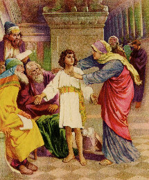 О детских годах Иисуса слишком подробно распространяться не принято. В т.н. канонических евангелиях нашел свое отображение единственный эпизод из его детства - посещение Храма Господнего во время праздника Пасхи (Лука.2:41-52). Да и тот является, по сути, лишь довольно поздней "калькой", совпадающей в мельчайших подробностях с данными апокрифического (не официального, не канонического и практически запрещенного) "Евангелия детства" Фомы. (А ведь он входил в число 12 апостолов!) Кое-что (опять-таки, взятое у Фомы) публикуется иногда в изданиях Библии для детей, но только частично и строго избирательно (только "то, что нужно" детям). Даже сам исходный апокрифический текст Фомы при переизданиях то и дело подвергается купюрам (избирательным сокращениям). Объективность и достоверность при этом никого не волнует. Как пишет Фома, Иисус в детстве был, за редкими исключениями, довольно непослушным, строптивым, своенравным, а часто и просто жестоким мальчиком. Но, якобы, уже тогда умевшим творить чудеса.