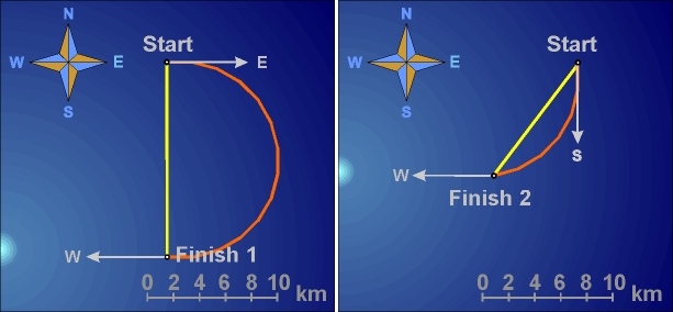 На самом деле примерные ответы на эти вопросы могут быть найдены путем графического построения маршрута их движения. Если преположить, что вся информация о Вифлеемской звезде в Новом Завете записана без искажений. Начнем наши рассуждения с того, что увидеть звезду на востоке, наблюдать за ней и двигаться в ее направлении большую часть ночи можно только в том случае, если она появляется вечером, с наступлением ночи, и как раз в восточной (как об этом заявили мудрецы) части неба. Но в таком случае, когда первоначальное направление движения было выбранным прямо на восток, то в конце ночи, описав дугу и постепенно повернув на запад, путешественники просто оказались бы к югу от точки старта (в предположении, что скорость на всех участках пути примерно одинакова) - см.левый рисунок ниже. О никакой утренней звезде говорить вообще не приходится, так как при любой ее яркости она очень быстро утонула бы в лучах поднимающегося Солнца. И никто не смог бы за нею наблюдать в течение всего дня, вплоть до ее захода (почти одновременно с Солнцем, но чуть раньше). Тем более, следовать в ее направлении. И это было то же самое, что следовать за самим Солнцем, но в Библии ничего подобного нет. Если же звезда выходит из-за восточного горизонта в полдень (отставая от Солнца примерно на 6 часов), то из-за яркого дневного света она будет видна на небе не сразу (разве что в телескоп, но в те времена их еще не существовало), а только к вечеру, уже переместившись в направлении на юг, когда Солнце зайдет и наступит начало ночи (около 6 часов вечера). Мудрецы (из-за своей "мудрости"?) могут по-прежнему считать ее восточной (правда, не понятно, на каком основании), но стартовать, реально увидев ее на небе, прямо в южном направлении. В таком случае звезда дойдет до западного горизонта Земли примерно вдвое быстрее, чем в первом случае (ведь ей останется пройти всего примерно 90 градусов небесной окружности, а не 180, как в первом варианте - с вечера до утра). По времени - ближе к полуночи (по Солнцу!). А позже станет уже не видна (уйдет за западный горизонт). Путешественники пройдут за это время (всего около 6 часов) гораздо более короткий путь, зато его кончная точка (в момент захода звезды) окажется смещенной к юго-западу от точки старта. (Правый рисунок). И это фактически единственный (не считая промежуточных) в данных обстоятельствах вариант перемещения жителей Востока к западу относительно точки начала пути (да еще и при использовании "восточного" ориентира).