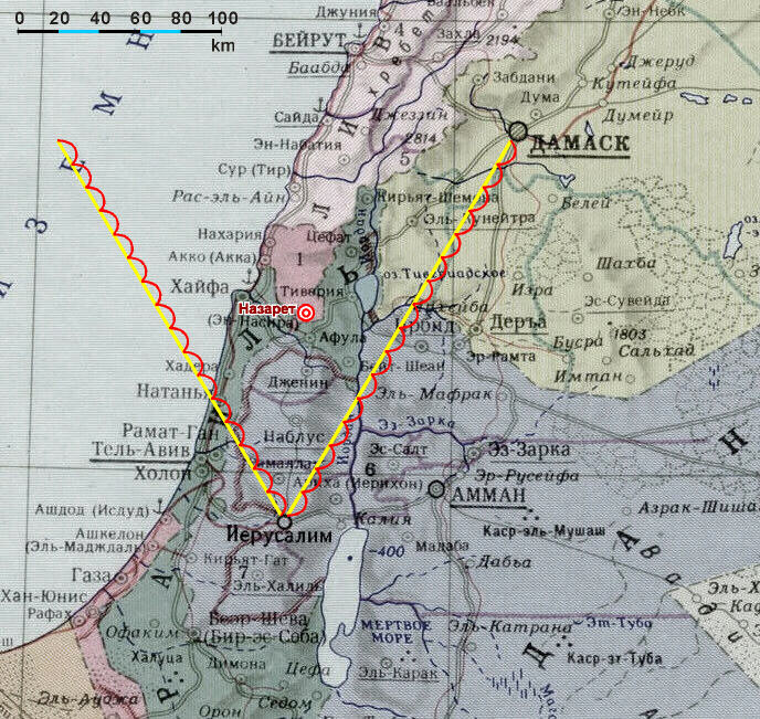 На чисто северном направлении от Иерусалима находится только Назарет, расположенный в Галлилее, - области самого большого Израиля. Тогда он считался глухоманью, к его жителям обитатели столицы относились с крайним скептицизмом, даже в период деяний уже взрослого Иисуса Христа ("назорея" или назаретянина). Поэтому прибывших оттуда лиц никто, тем более сам царь Ирод и его приближенные, не счел бы мудрецами. (Между прочим, некоторые историки даже не находят достаточно твердых доказательств того, что Назарет вообще существовал до истечения I-II веков н.э.) Бейрут (теперь - тоже расположенный к северу от Иерусалима) в те времена не имел какого-либо заметного влияния на жизнь иудеев (в Библии он ни разу даже не упоминается, тогда как, например, Дамаск - 55 раз). Аналогичным образом обстоит и ситуация с Амманом (лежащим прямо на восток). Вифлеемская звезда никак не могла кого-либо привести в Иерусалим оттуда (см.рисунки над картой). В итоге не трудно прийти к окончательному выводу, что мудрецы/волхвы прибыли в Иерусалим с северо-востока, а именно - из Дамаска. Дамаск удален от Иерусалима примерно на 220-240 километров. Покрыть такое расстояние быстрее, чем за показанные на рисунке 16 ночных переходов, наши путешественники могли бы только в том случае, если бы они были достаточно мудрыми, чтобы просто двигаться в нужном направлении по прямой, направление которой было совсем не трудно определить уже в первую ночь путешествия. И сориентированной от Дамаска прямо на Иерусалим. В связи с этим имело смысл двигаться не строго по прямой, а по имевшимся между этими городами караванным путям. И совсем не обязательно только ночью. Так оно, скорее всего, и было. Предполагать появление чудо-ребенка, будущего царя Израиля, в произвольном месте пустыни, для мудрецов было бы уж слишком наивно. Дамаск всегда был одним из культурно-исторических центров арабского мира. Его правителей всегда беспокоило соседство Израиля, в котором они не без оснований видели потенциальную угрозу для себя. Поэтому арабы внимательно следили за всем, происходящим в государстве иудеев. Так что, скорее всего, наши "мудрецы" направлялись сюда еще и в качестве своеобразных разведчиков. Тем более, что благодаря своему статусу, они были вхожи даже в царский дворец.